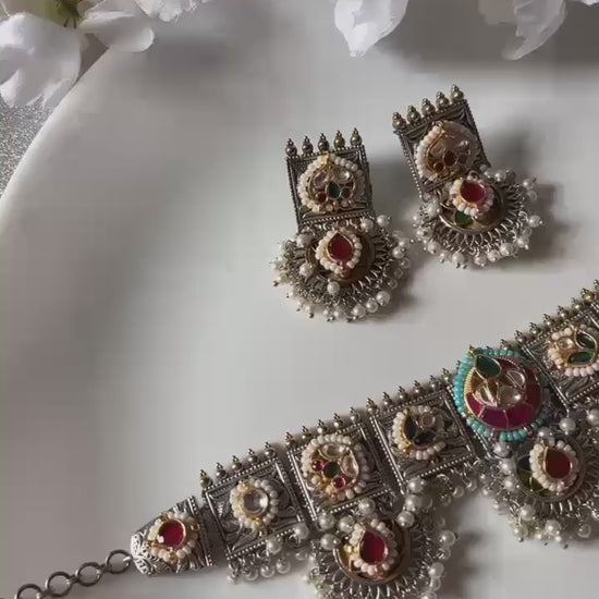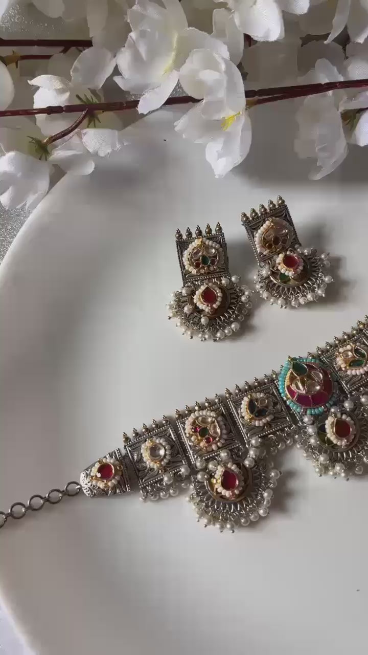 Add a touch of royal elegance with Alankrent Luxe’s SLA Necklace Set, a stunning fusion of antique silver artistry and traditional Kundan craftsmanship.