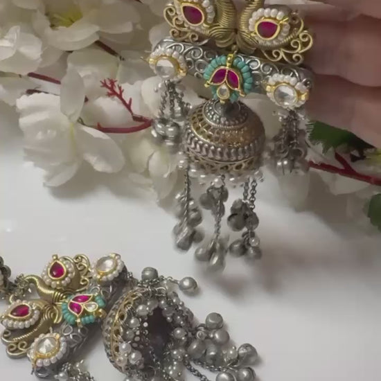 Elevate your traditional look with these stunning Antique Dual-Tone Peacock Jhumka Earrings. These elaborate chandelier-style earrings draw inspiration from traditional temple jewelry and feature a captivating blend of gold and oxidized silver finishes, giving them a unique, vintage appeal.
