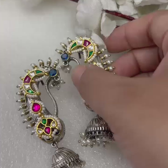 This Pacchi Kundan Fusion Dual tone Earcuff is expertly designed for a stylish Navratri or boho look. Made with a unique combination of pacchi and kundan, this earcuff adds a touch of elegance and trendiness to your outfit. Embrace the fusion of traditional and contemporary fashion with this must-have accessory.