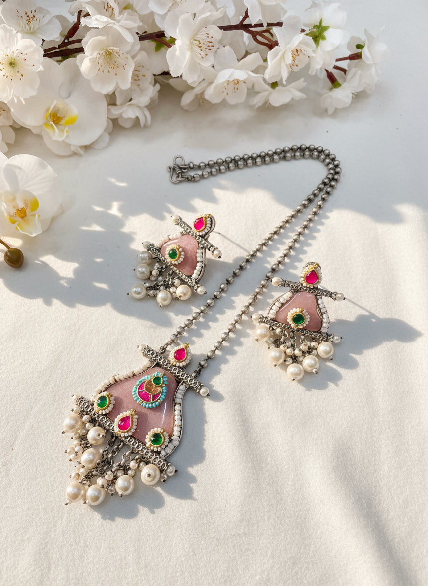 Each set features a unique inverted pyramid-shaped pendant, brought to life with vibrant and rich Meenakari (enamel work). Intricate Kundan stones and a cascade of playful pearl tassels add the perfect touch of festive glamour. Crafted in a beautiful oxidized finish with gold-polished accents, this unique design is now available in two mesmerizing shades.