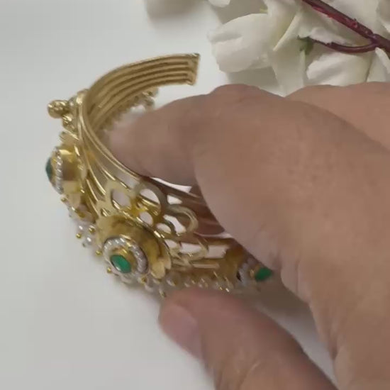 ​Elevate your ethnic look with our exquisite Antique Gold Tone Handcuff Kada. This stunning broad bracelet features an intricate floral design set with vibrant stones and accented with a border of delicate faux pearls. The lower edge is adorned with cascading pearl danglers, adding a touch of traditional grandeur. The open, multi-band design ensures a comfortable and adjustable fit. Perfect for weddings, festive occasions, or as a statement piece for any traditional ensemble.