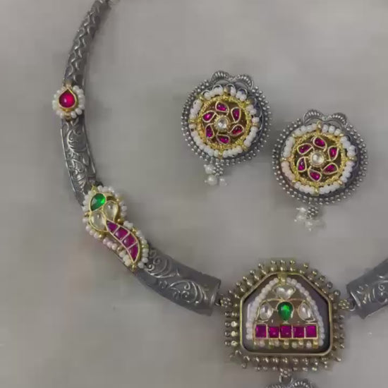 Shop the Navratri Kundan Silver Necklace Set, featuring antique silver work with ruby & emerald kundan detailing. A perfect jewellery set for Durga Puja, Garba nights, and festive occasions. Pair it with sarees, lehengas, or ethnic wear for a divine festive glow.