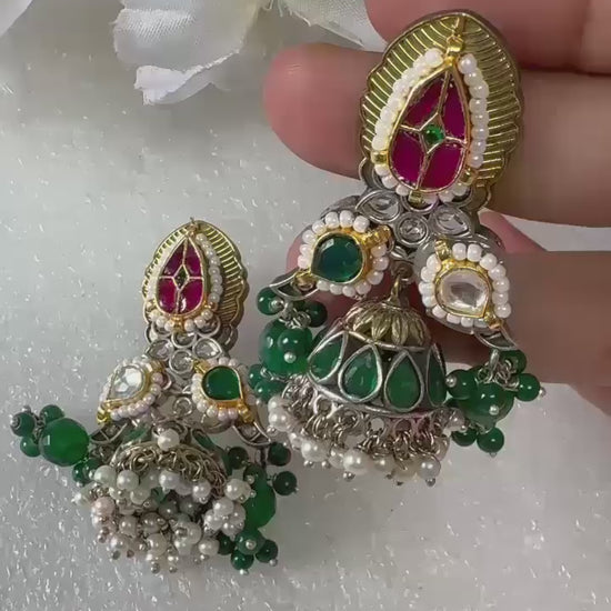 Elevate your ethnic ensemble with our stunning Traditional Indian Jhumka Earrings. These exquisite bell-shaped earrings feature intricate Kundan jewelry work, highlighted by a rich, teardrop-shaped stud set with magenta and white stones, reminiscent of classic Meenakari artistry. The beautiful green dome (jhumka) is adorned with lush Emerald green beads and delicate seed pearls, offering a luxurious, festive look.
