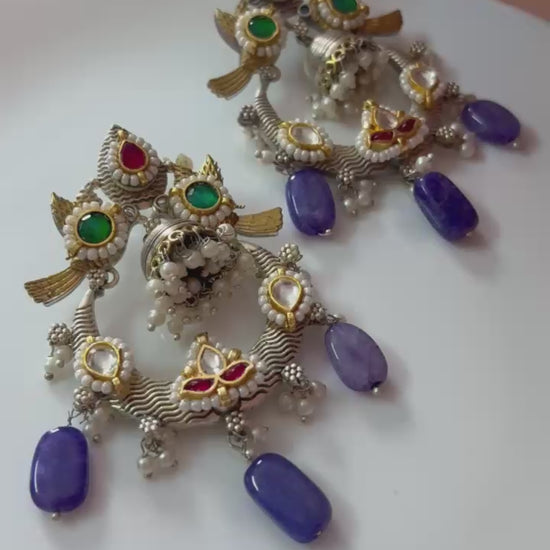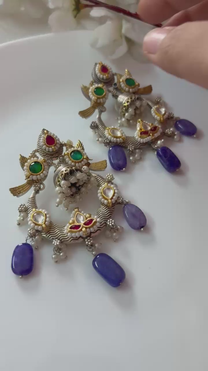 The Alankrent NeelTarang Temple Hoop Danglers are a stunning fusion of traditional temple artistry and contemporary design. Featuring dual-tone detailing, colourful Kundan stones, elegant bird motifs, and premium pearl clusters, these earrings stand out with their striking deep-blue stone drops that add a bold, regal touch.