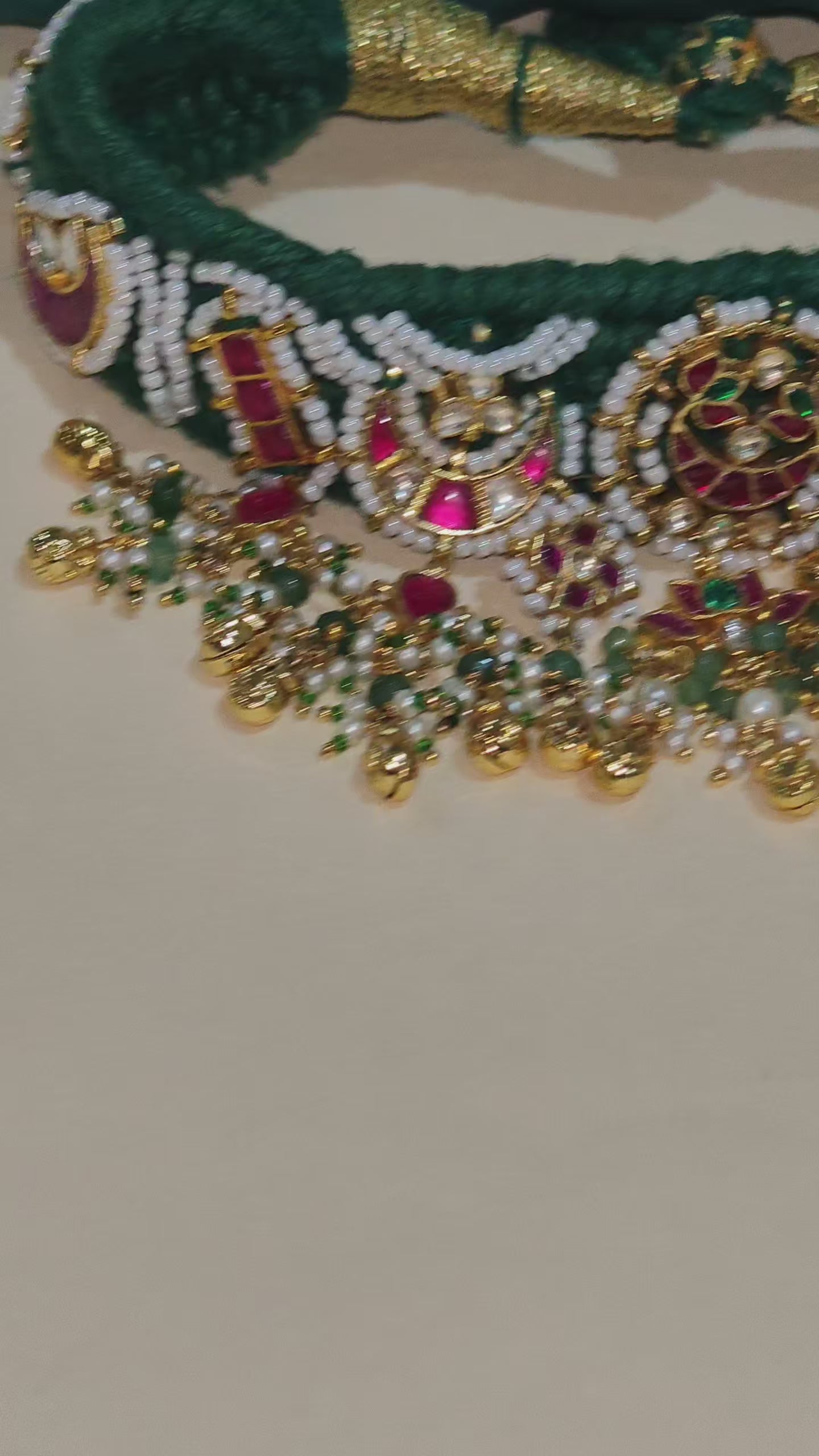 This Handmade Pacchi Kundan Choker Set is crafted on a beautifully hand-crocheted heavy cotton base, making it a unique blend of traditional craftsmanship and heritage jewelry design. The choker features intricate Pacchi Kundan work with ruby-toned stones, pearls, and delicate bead detailing arranged in classic royal motifs.