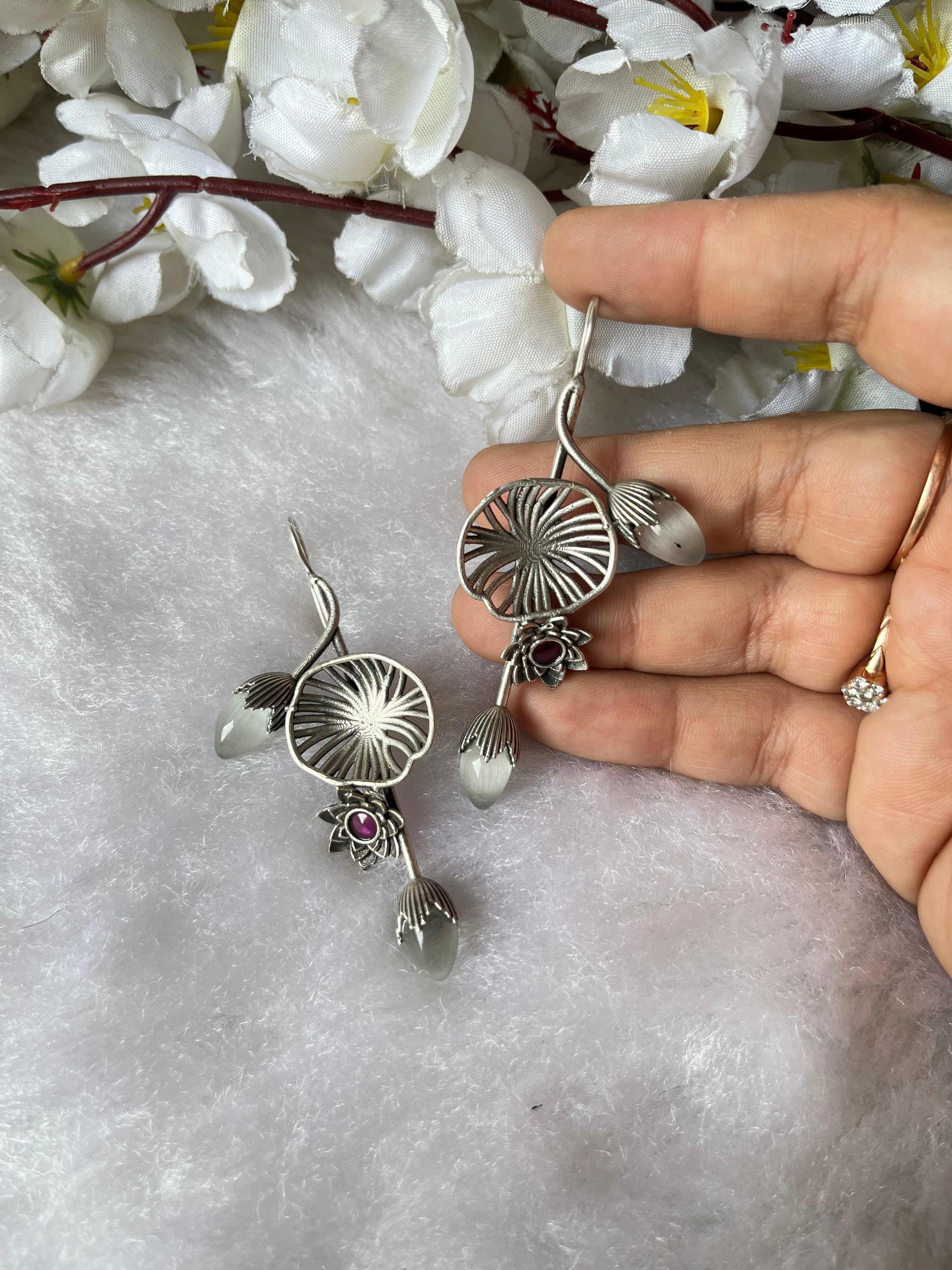oxidised silver earrings, lotus earrings, floral drop earrings, boho jewellery, ethnic earrings for women, handmade silver earrings, Alankrent jewellery