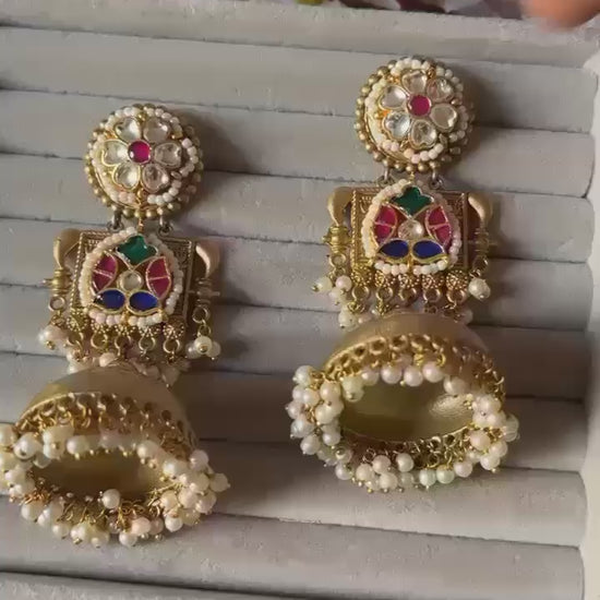 Shop exquisite Pachi Kundan bridal jhumkas online. These heavy, antique gold earrings with Meenakari work & pearls are perfect for weddings, Karwa Chauth & Diwali.