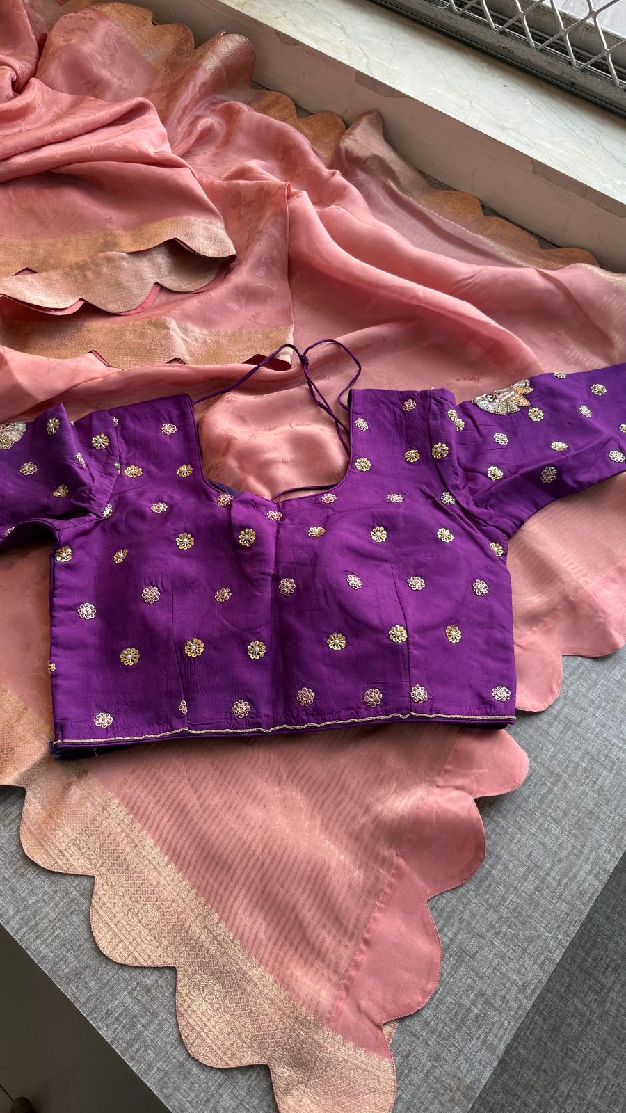 - Blouse Work: Handcrafted Zardozi, Pearl, Resham, Sequins & Gotapatti embroidery