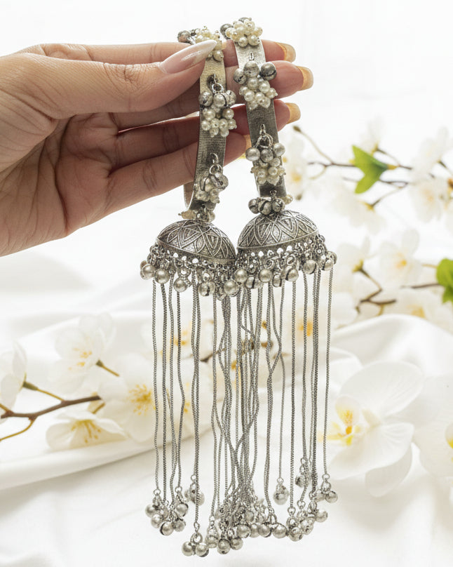 Rajwada Noor Jhumar Bangles in German Silver with Silver Polish | Heavy Traditional Danglers | Size up to 2.6
