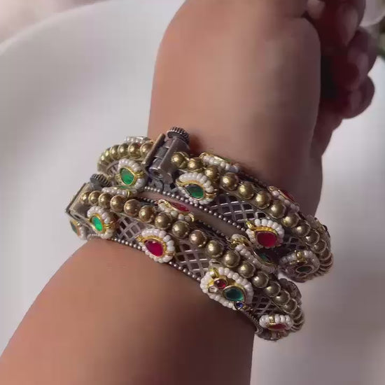 Shop our grand Samira Kundan Jali kadas. This dual-tone pair with a double ghungroo border is handcrafted for weddings, Navratri, and all festive Indian occasions. Order now.