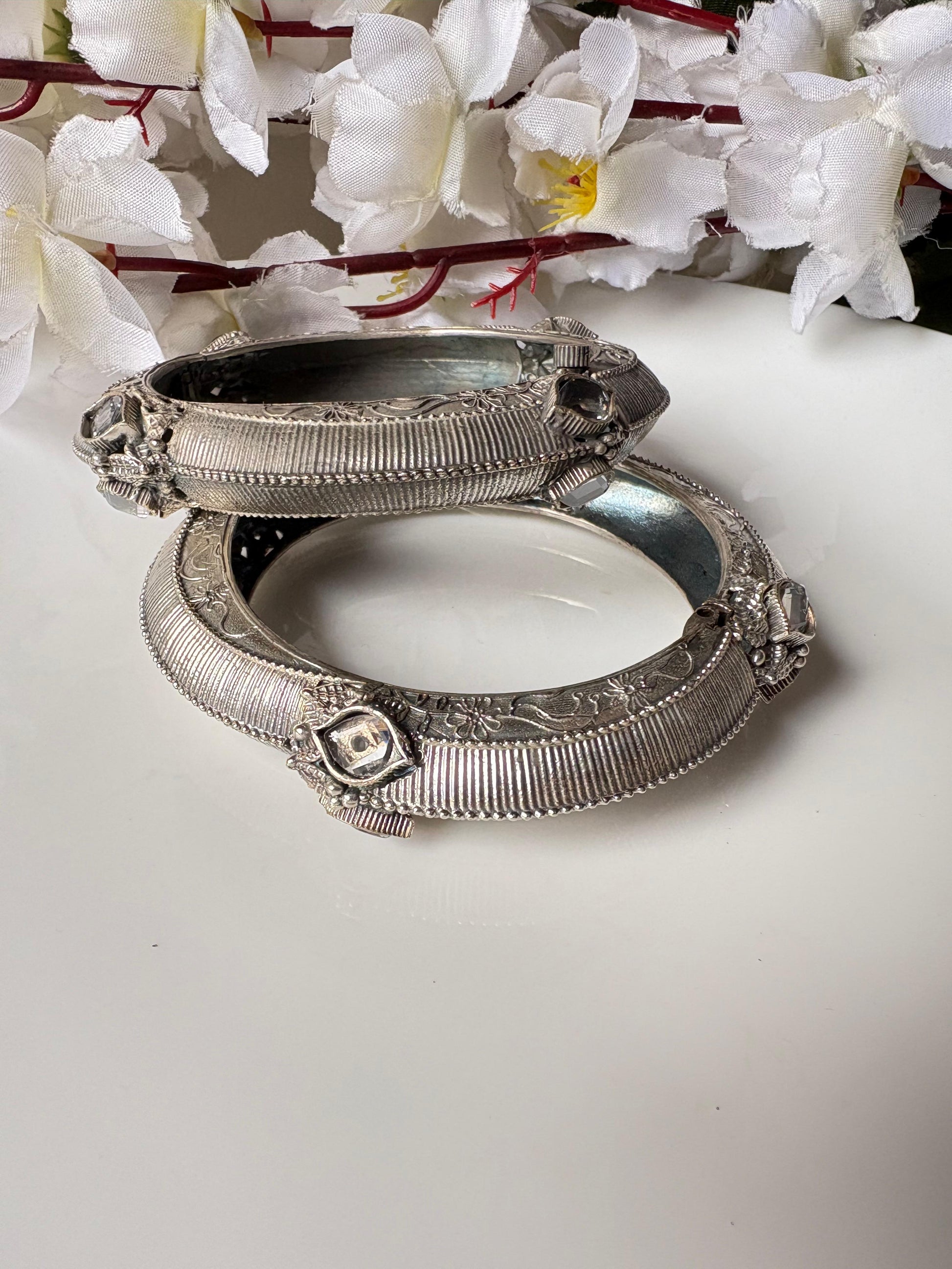 Discover timeless elegance with our handcrafted kadas. Featuring intricate carvings and a stunning antique silver finish, these bangles are a testament to classic craftsmanship. The perfect statement piece to elevate your ethnic and fusion wear. Own a piece of heritage.