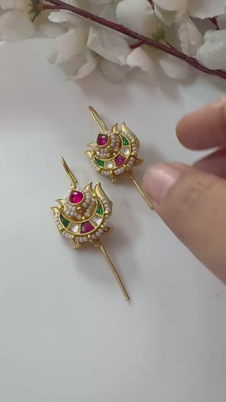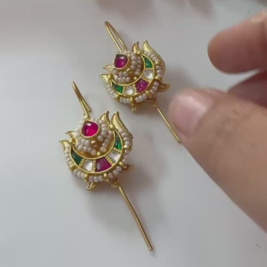 Handcrafted Gold-Plated Matti Ear Pins featuring Ruby, Pearl, and Kundan work. Classic South Indian Kanphool style for weddings and festive occasions.