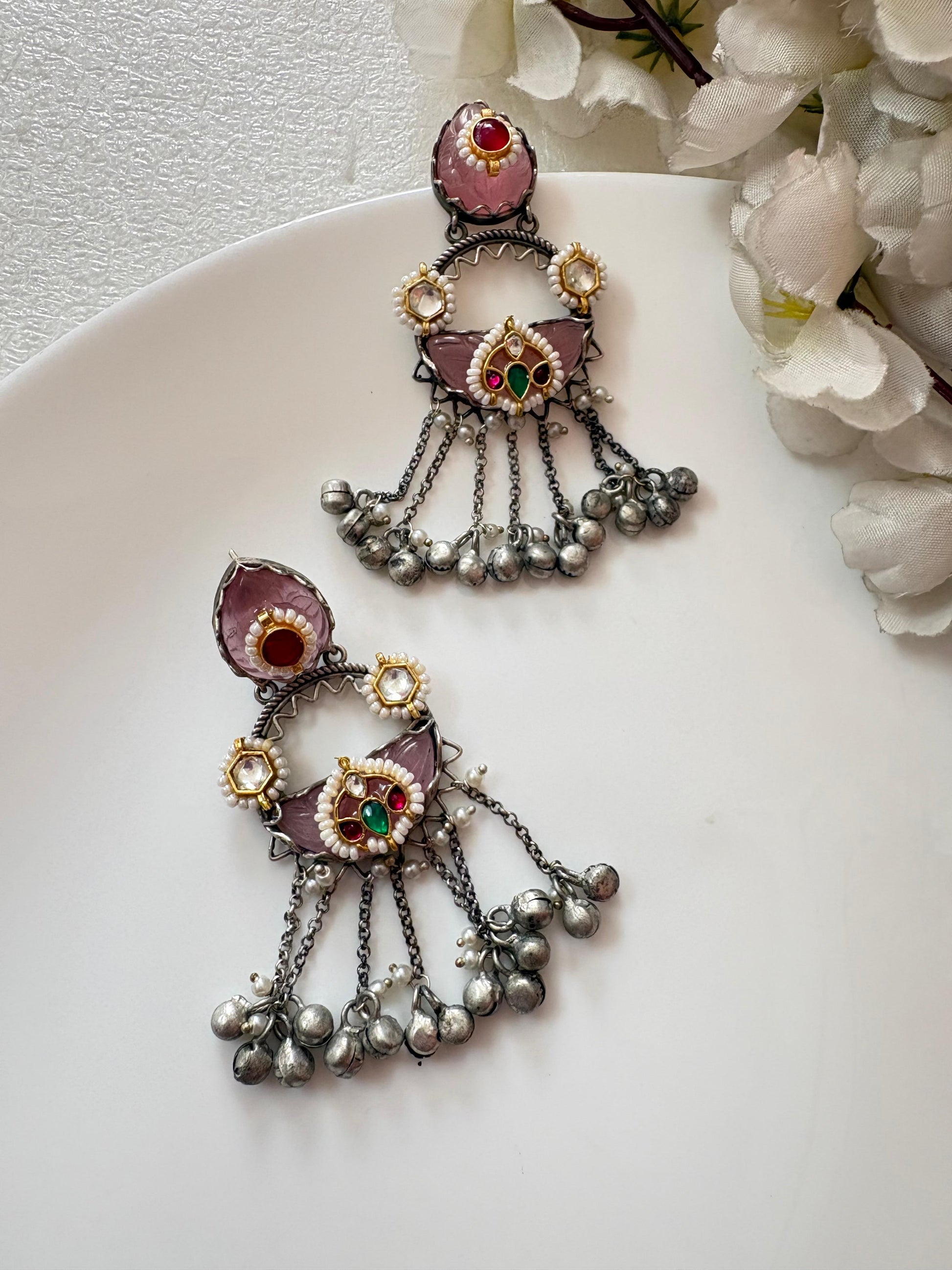 Accented with delicate pearl borders, vibrant enamel stones (available in Pink, Red & Green), and silver ghungroo chains that sway beautifully with every move — these earrings embody raw elegance and festive charm.
